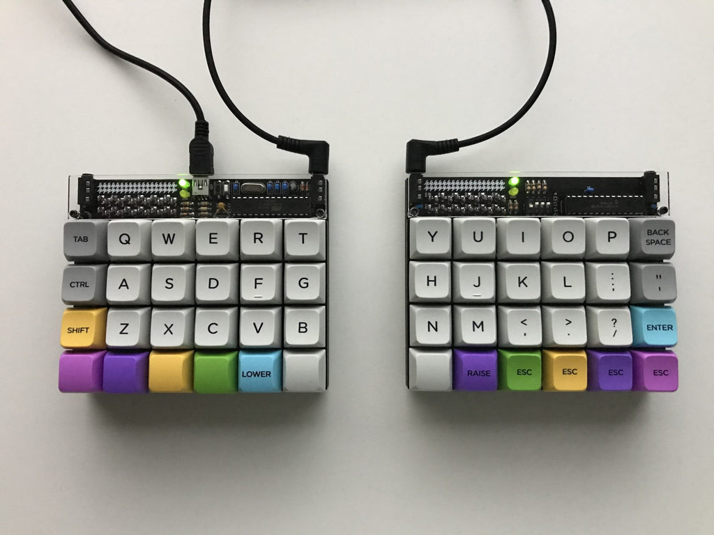 デフォルトの構成では、USBコネクタの付いている方が左側に来るように、左右のキーボードを接続しますが、USBコネクタが右側に来る方が都合の良い場合もあります。そう言ったケースにも対応できるように、(ファームウェアの変更とビルドが必要ですが)左右のキーボード配置を入れ替えることができます。