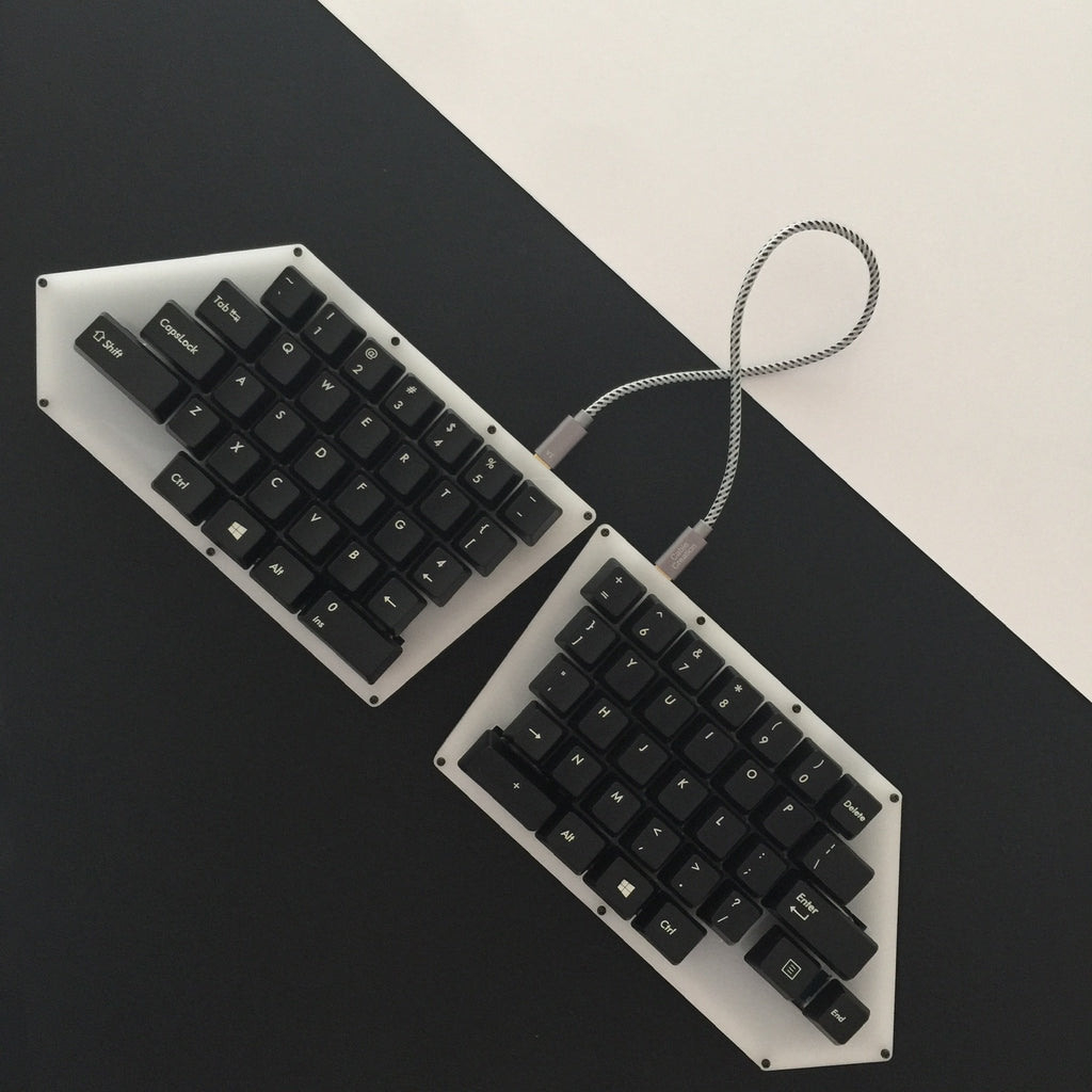 MiniAxeの分割式オーソリニア(直行配列)も良いですが、それを少し内側に向けてハの字に置くと打ち易くなるという気付きもあり、以前から気になっていたちょっと変わった形のシンメトリカルレイアウトを採用してみました。